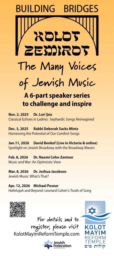 We are thrilled to announce the theme for this year’s speaker’s series titled Kolot Zemirot: The Many Voices of Jewish Music. This six-part series celebrates the depth, diversity, and vibrancy of Jewish music and identity. In a year when our community and the broader Jewish world continue to face challenges, our series offers opportunities for inspiration, education, and connection through the universal language of music. Beginning in November/25, all monthly events are offered free on Zoom at 11 AM PT. Pre-registration is required.